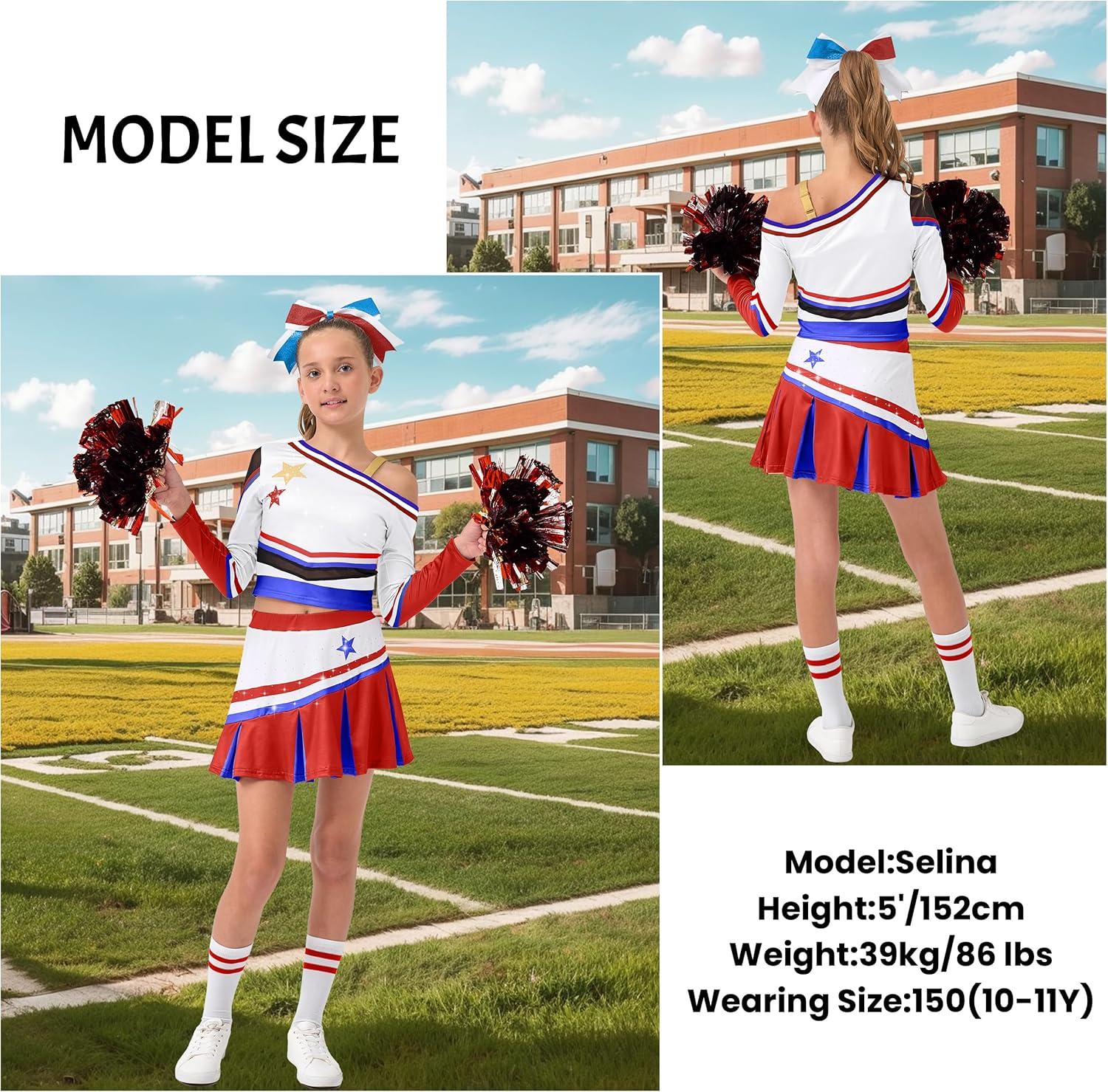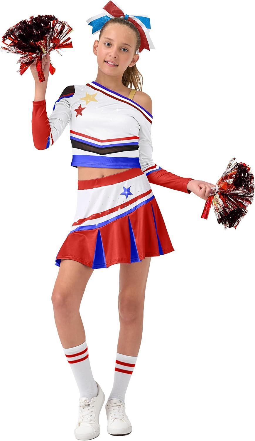 LOLANTA Girls Cold-Shoulder Cheerleader Costume Sparkle Mesh Patchwork Cheer Uniform Halloween Party Cheerleading Outfit(Red)