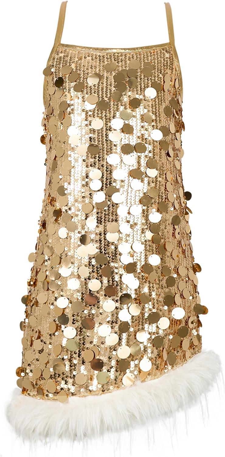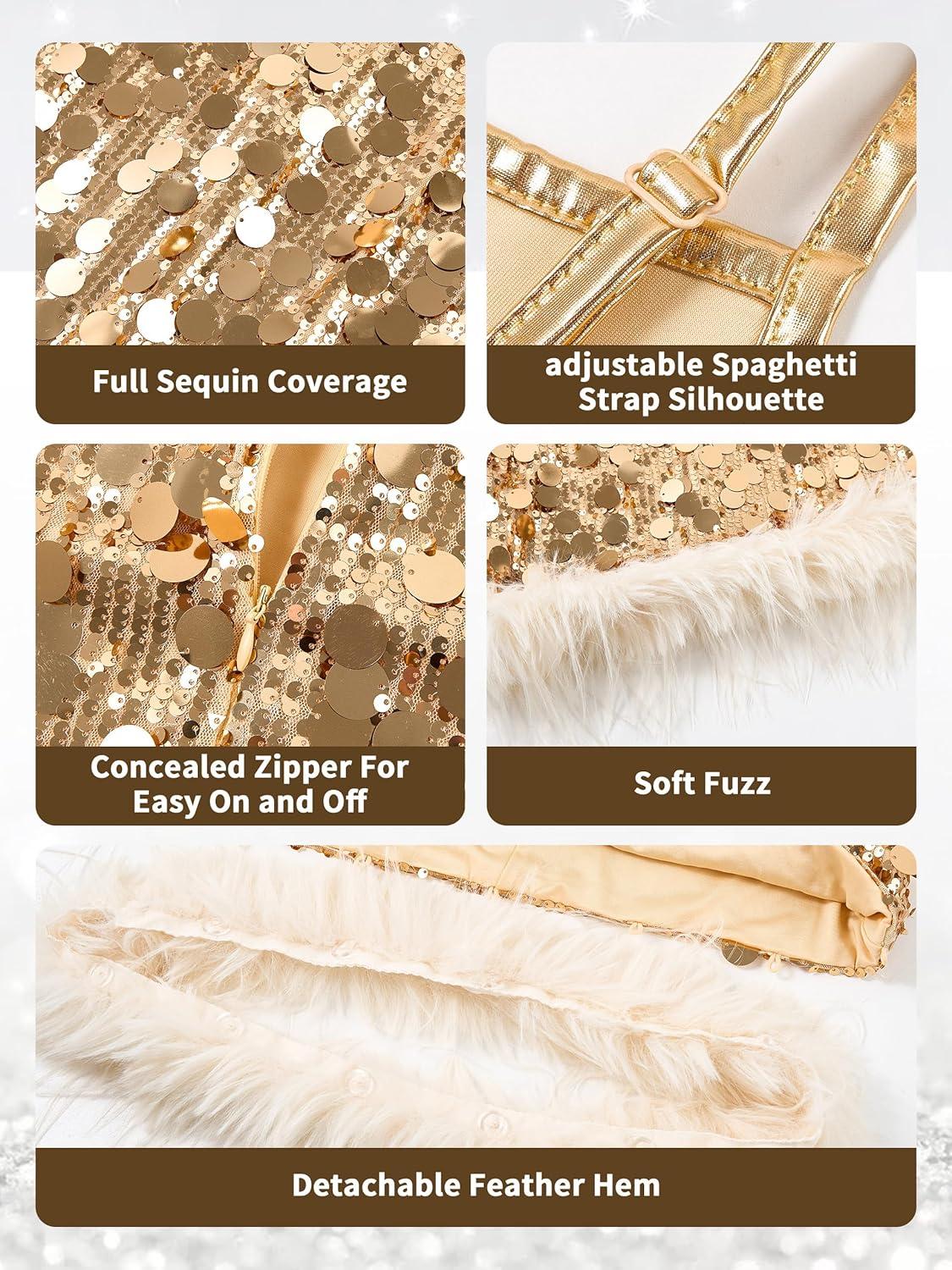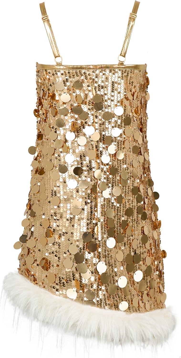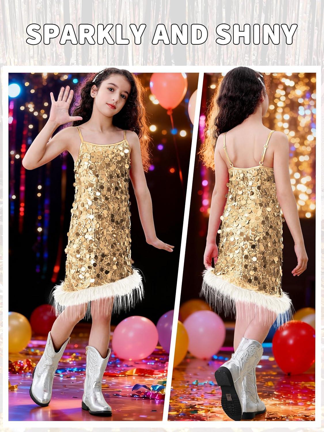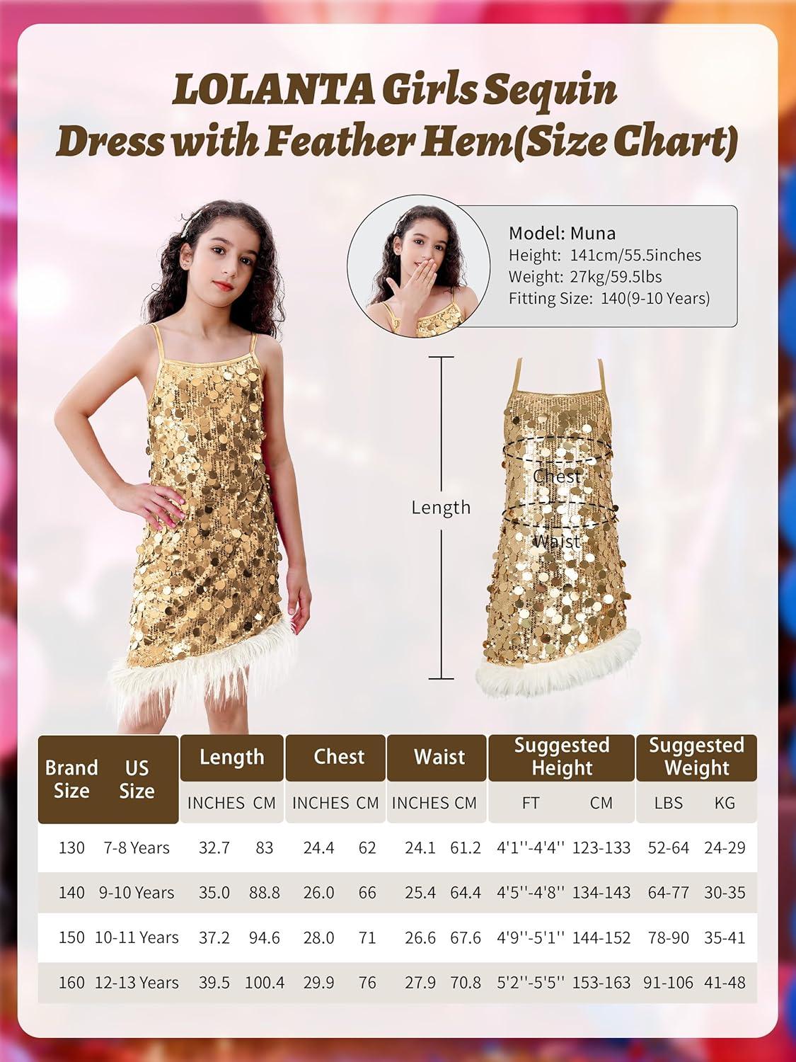 LOLANTA Girls Sequin Dress with Detachable Feather Hem. Dazzle the spotlight in this stunning sequin dress designed for little stars! This dress features full coverage of shimmering sequins that catch and reflect light beautifully—perfect for stage, birthday, weddings, Christmas, prom parties, school dance, photo shoots, or festive celebrations and special occasions. The dazzling effect enhances every movement, adding dynamic visual impact. Crafted with a lightweight sheer mesh base, the dress offers stretchability and breathability, allowing freedom of movement. The soft lining ensures all-day comfort. The feather hemline adds texture, elegance, and a touch of glamour. The faux feathers are soft, flutter gently, and create a beautiful contrast with the bold sequins. Details matter: the slim patent leather spaghetti straps offer a delicate yet modern look while providing a comfortable fit without scratching the skin. The strappy design adds a playful yet chic vibe, making it an unforgettable party piece!