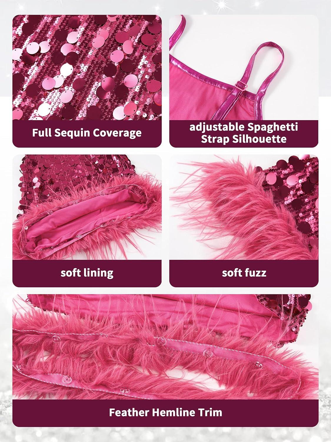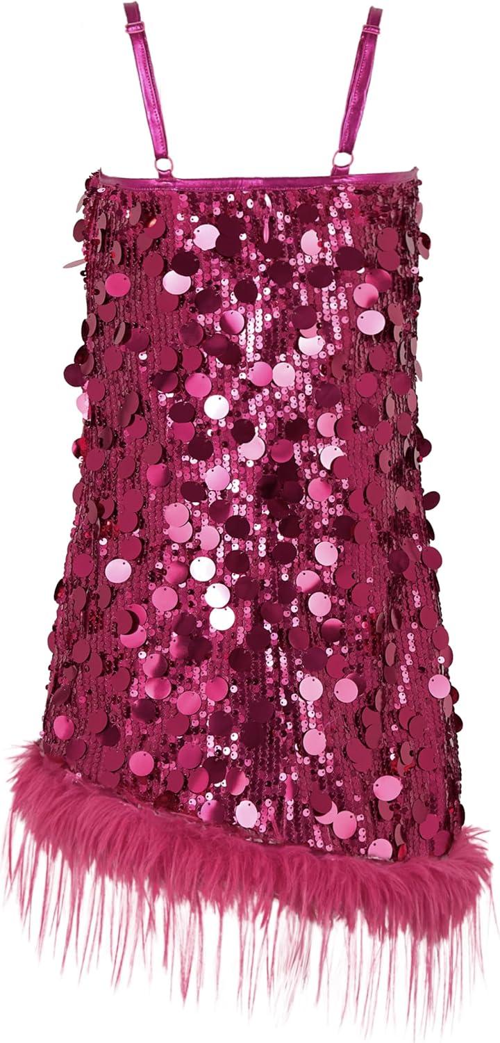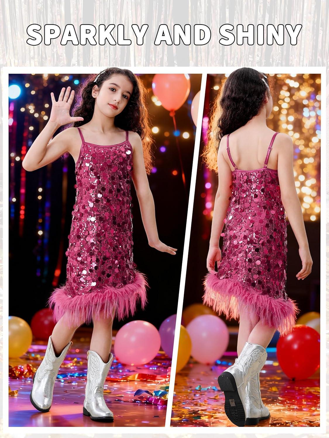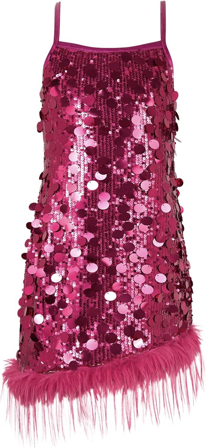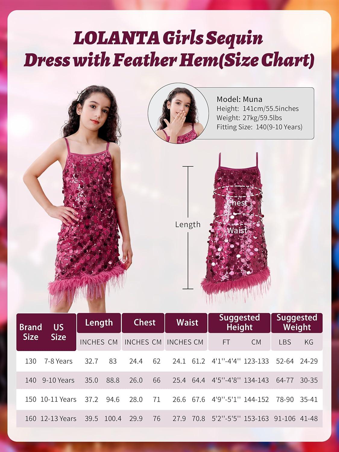 LOLANTA Girls Sequin Dress with Detachable Feather Hem. Dazzle the spotlight in this stunning sequin dress designed for little stars! This dress features full coverage of shimmering sequins that catch and reflect light beautifully—perfect for stage, birthday, weddings, Christmas, prom parties, school dance, photo shoots, or festive celebrations and special occasions. The dazzling effect enhances every movement, adding dynamic visual impact. Crafted with a lightweight sheer mesh base, the dress offers stretchability and breathability, allowing freedom of movement. The soft lining ensures all-day comfort. The feather hemline adds texture, elegance, and a touch of glamour. The faux feathers are soft, flutter gently, and create a beautiful contrast with the bold sequins. Details matter: the slim patent leather spaghetti straps offer a delicate yet modern look while providing a comfortable fit without scratching the skin. The strappy design adds a playful yet chic vibe, making it an unforgettable party piece!