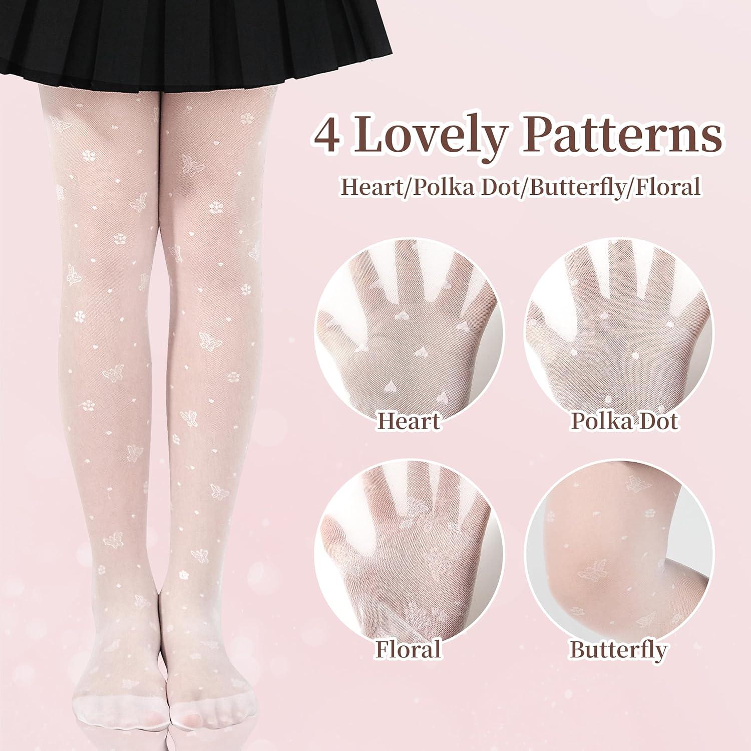 LOLANTA Girls Sheer Tights 2 Pack Heart Polka Dot Patterned Stockings Kids Soft Lightweight Stretchy Pantyhose 3-11Years(White Butterfly + White Flower)