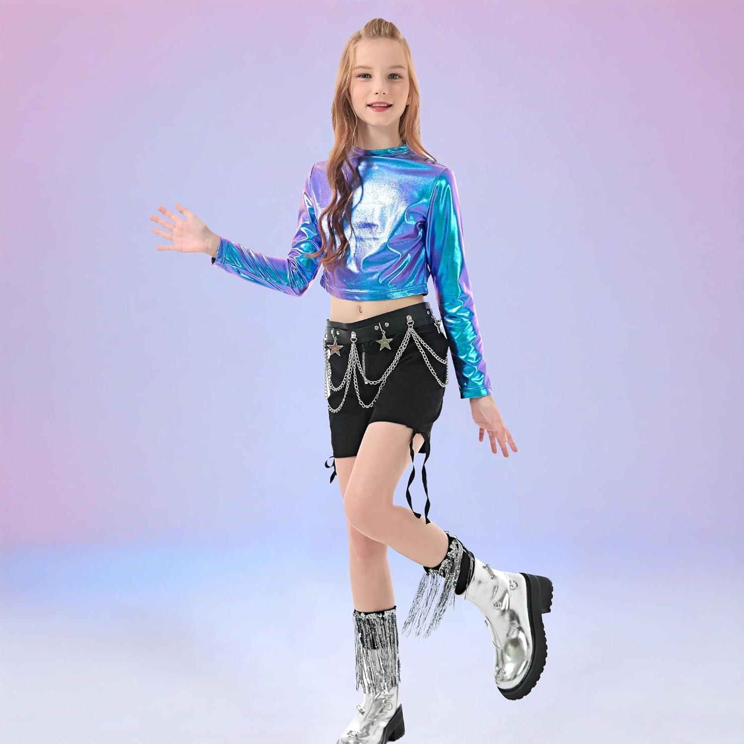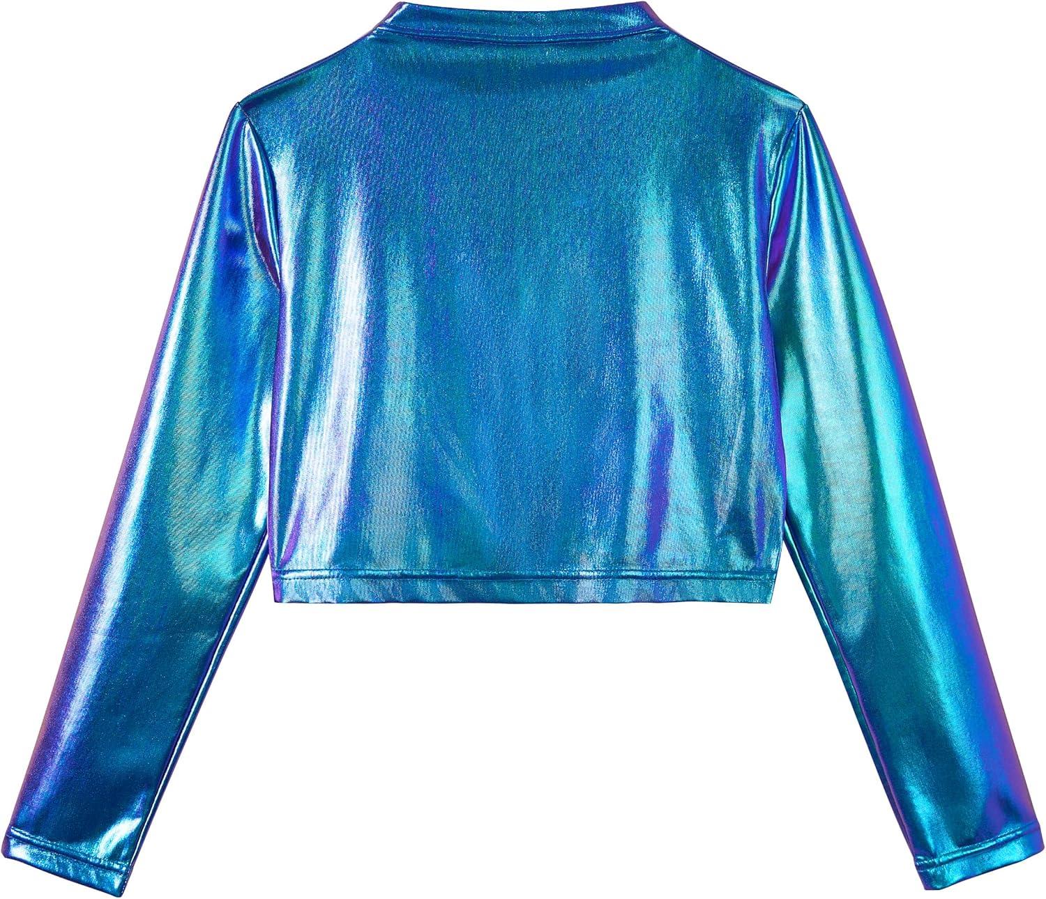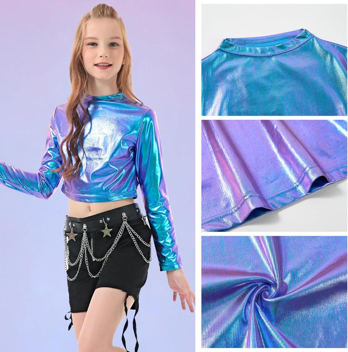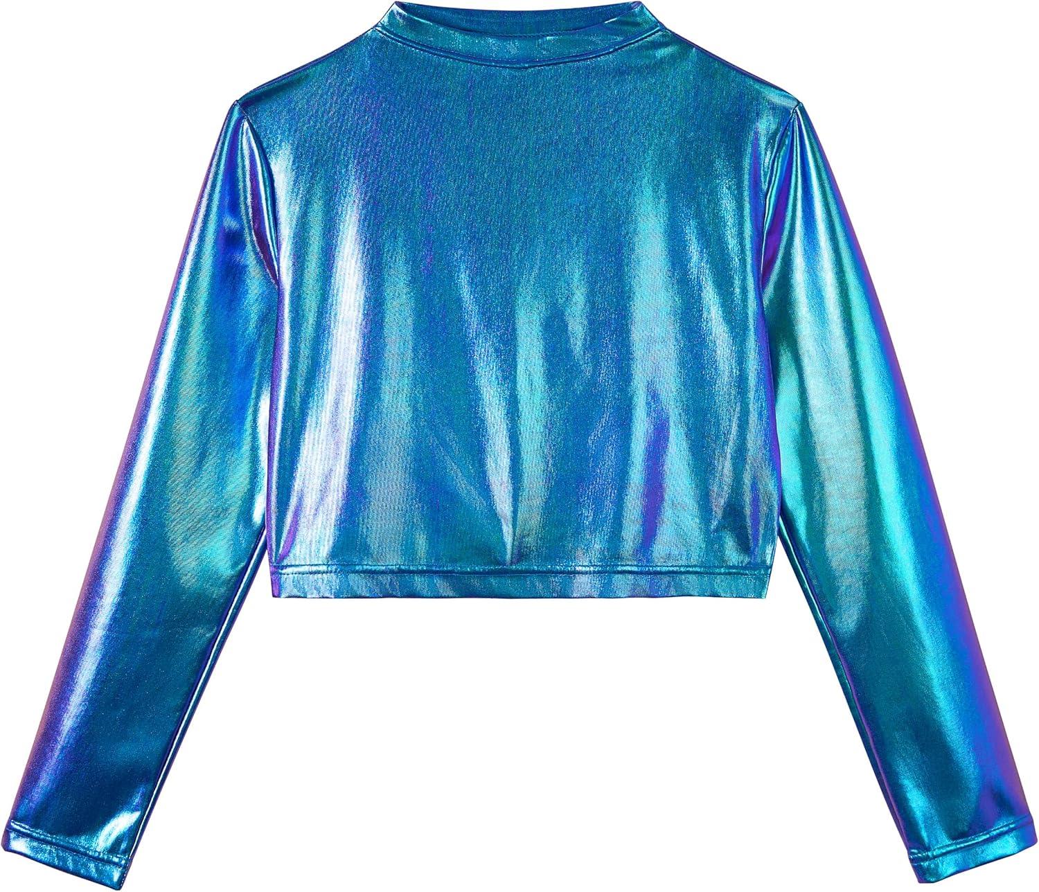 LOLANTA Metallic Dance Tops for Girls Long Sleeve Cropped Y2K Top Shiny Disco Streetwear Rave Party Festivals Costumes(Blue Purple)